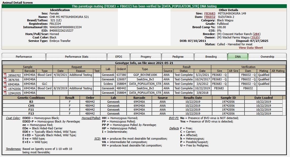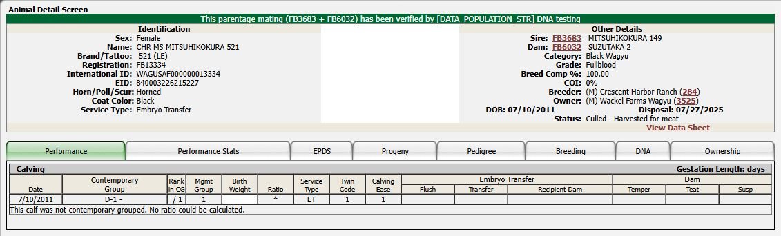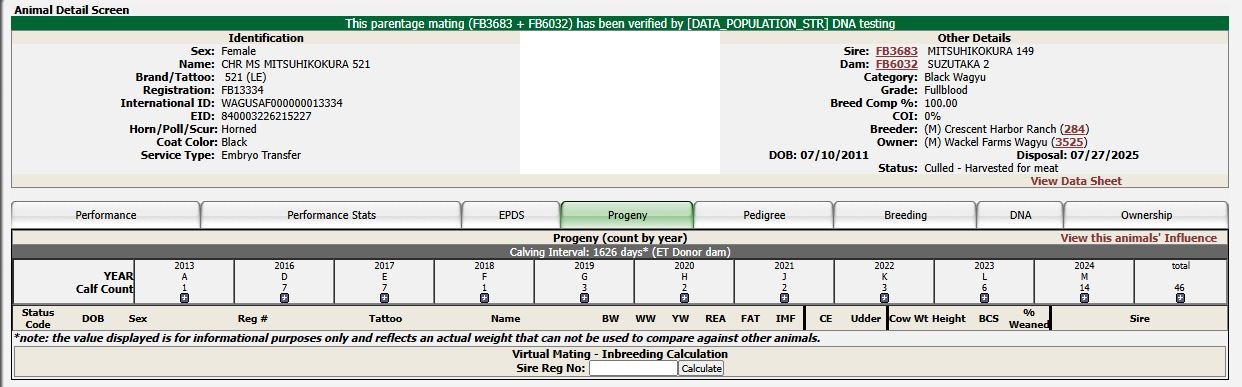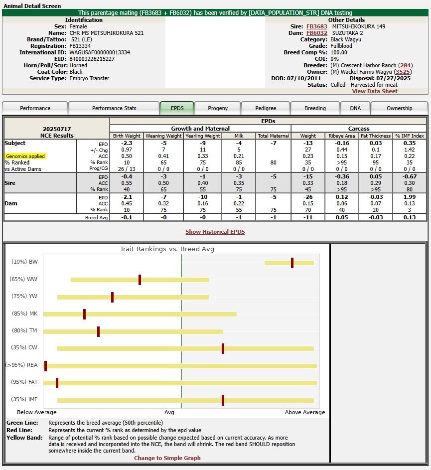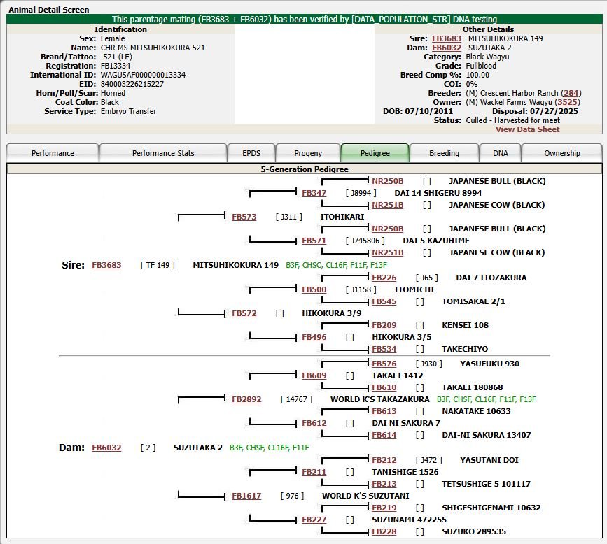 With great pride, we present CHR Ms. Mitsuhikokura 521, the direct daughter of the revered TF 149 Mitsuhikokura and Suzutaka 2. This remarkable female Wagyu cattle for sale alabama carries an exceptional lineage that blends the marbling genetics of Tanshige and the Kumanami strain of Tajima, which are traced back to the legendary World K’s Suzutani. Additionally, this lineage is enhanced by the great line of Yasufuku J930, World K’s Takazakura, and the superior growth of TF 149 Mitsuhikokura.